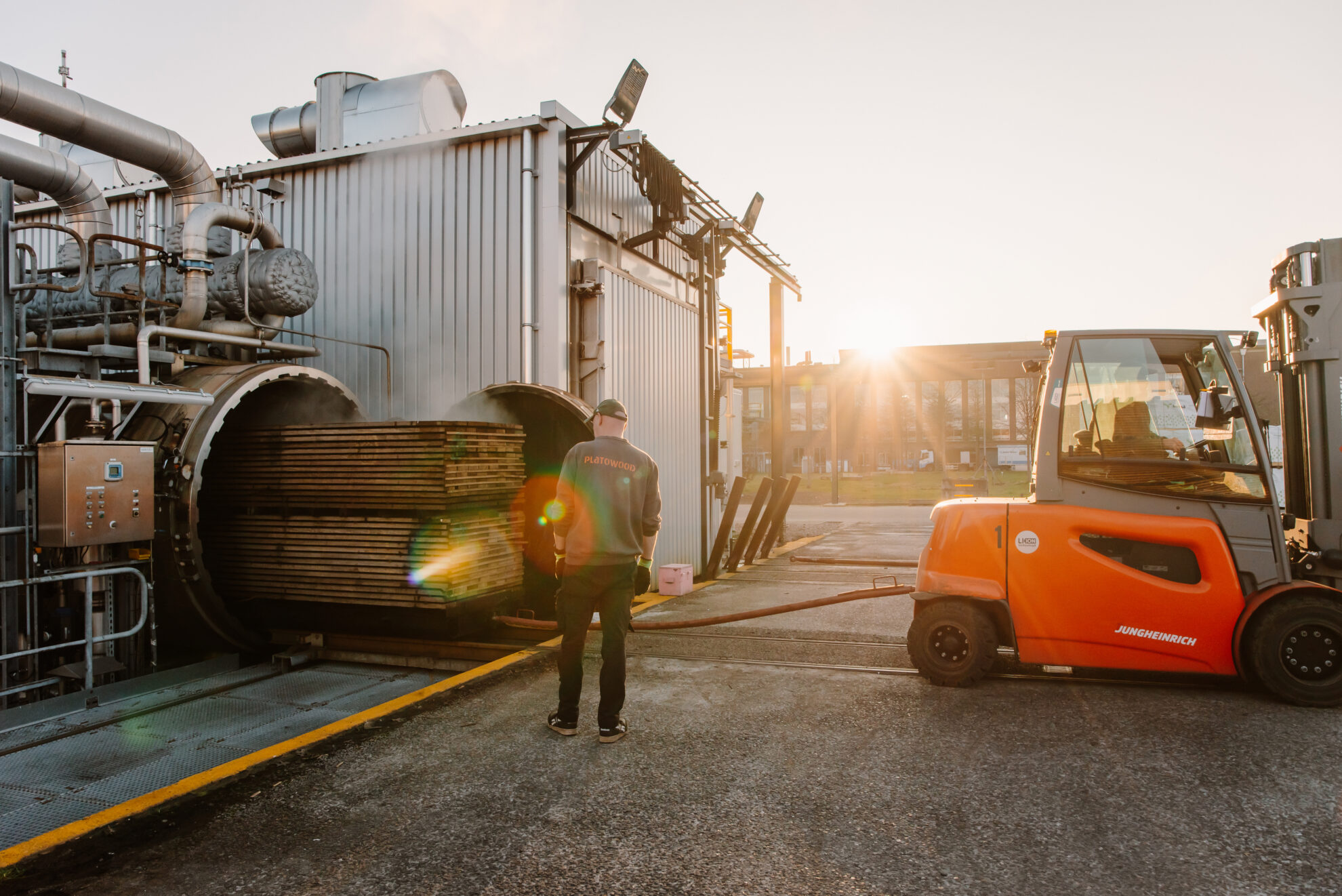 Platowood beschikt over een eigen fabriek op Cleantech Park Arnhem, waar snelgroeiende houtsoorten uit gecertificeerde bossen een proces van ‘platoniseren’ (hydro-thermische modificatie) ondergaan. In dit proces wordt hout eerst met behulp van stoom en onder verhoogde druk verhit tot maximaal 170⁰C. Vervolgens wordt het hout zorgvuldig en geleidelijk teruggedroogd en daarna in een oven ‘gebakken’ op maximaal 190⁰C.